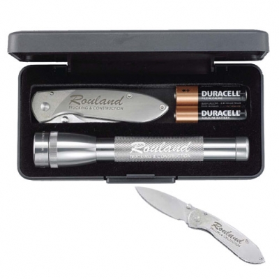 Here are 2 favorite brand names in one gift set. Your choice of Mag-Lite® color and the popular stainless steel Buck® Nobleman Knife. Mag-Lite is 5 3/4" long. The knife is 3 3/4" closed, and has a 2 5/8" blade. Heavy duty brushed stainless steel handle. Package includes 2 “AA” batteries.